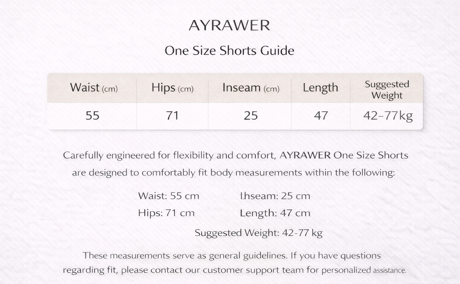 To minimize sizing uncertainties and ensure a more confident purchasing experience, AYRAWER has chosen to introduce a one-size shorts design, carefully engineered to adapt to a wide range of body shapes.